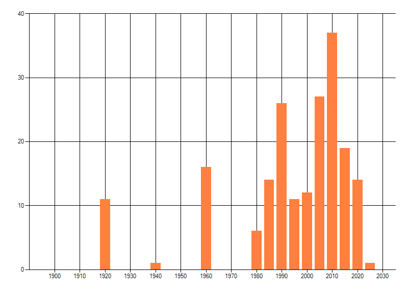 Het aantal atlasblokken (5x5 km) waarin de soort is gemeld binnen een periode van vijf jaar (vanaf 1980) of twintig jaar. Niet gecorrigeerd voor waarnemersinspanning en het aantal doorgegeven waarnemingen kan sterk variëren per periode, dus een trend in verspreiding kan hier niet direct uit worden afgelezen. Het opgegeven jaartal is het eerste jaar van de periode. Bron: gevalideerde waarnemingen uit de NDFF.