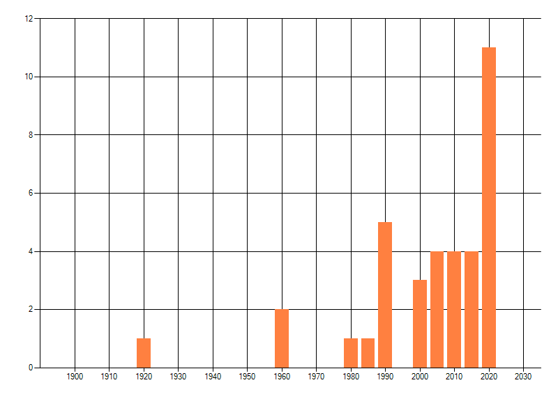 Het aantal atlasblokken (5x5 km) waarin de soort is gemeld binnen een periode van vijf jaar (vanaf 1980) of twintig jaar. Niet gecorrigeerd voor waarnemersinspanning en het aantal doorgegeven waarnemingen kan sterk variëren per periode, dus een trend in verspreiding kan hier niet direct uit worden afgelezen. Het opgegeven jaartal is het eerste jaar van de periode. Bron: gevalideerde waarnemingen uit de NDFF.