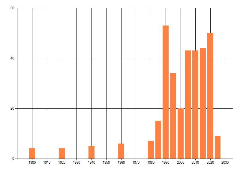 Het aantal atlasblokken (5x5 km) waarin de soort is gemeld binnen een periode van vijf jaar (vanaf 1980) of twintig jaar. Niet gecorrigeerd voor waarnemersinspanning en het aantal doorgegeven waarnemingen kan sterk variëren per periode, dus een trend in verspreiding kan hier niet direct uit worden afgelezen. Het opgegeven jaartal is het eerste jaar van de periode. Bron: gevalideerde waarnemingen uit de NDFF.