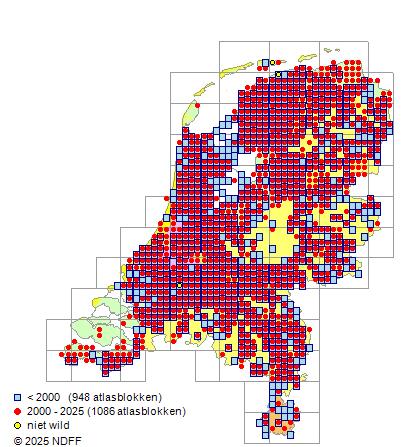 Het aantal atlasblokken (5x5 km) waarin de soort is gemeld binnen een periode van vijf jaar (vanaf 1980) of twintig jaar. Niet gecorrigeerd voor waarnemersinspanning en het aantal doorgegeven waarnemingen kan sterk variëren per periode, dus een trend in verspreiding kan hier niet direct uit worden afgelezen. Het opgegeven jaartal is het eerste jaar van de periode. Bron: gevalideerde waarnemingen uit de NDFF.
