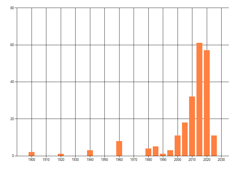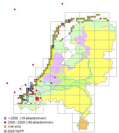 Het aantal atlasblokken (5x5 km) waarin de soort is gemeld binnen een periode van vijf jaar (vanaf 1980) of twintig jaar. Niet gecorrigeerd voor waarnemersinspanning en het aantal doorgegeven waarnemingen kan sterk variëren per periode, dus een trend in verspreiding kan hier niet direct uit worden afgelezen. Het opgegeven jaartal is het eerste jaar van de periode. Bron: gevalideerde waarnemingen uit de NDFF.