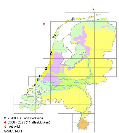 Het aantal atlasblokken (5x5 km) waarin de soort is gemeld binnen een periode van vijf jaar (vanaf 1980) of twintig jaar. Niet gecorrigeerd voor waarnemersinspanning en het aantal doorgegeven waarnemingen kan sterk variëren per periode, dus een trend in verspreiding kan hier niet direct uit worden afgelezen. Het opgegeven jaartal is het eerste jaar van de periode. Bron: gevalideerde waarnemingen uit de NDFF.