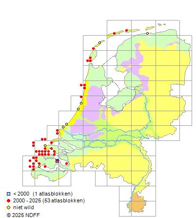 Het aantal atlasblokken (5x5 km) waarin de soort is gemeld binnen een periode van vijf jaar (vanaf 1980) of twintig jaar. Niet gecorrigeerd voor waarnemersinspanning en het aantal doorgegeven waarnemingen kan sterk variëren per periode, dus een trend in verspreiding kan hier niet direct uit worden afgelezen. Het opgegeven jaartal is het eerste jaar van de periode. Bron: gevalideerde waarnemingen uit de NDFF.