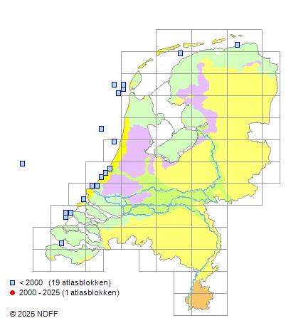 Het aantal atlasblokken (5x5 km) waarin de soort is gemeld binnen een periode van vijf jaar (vanaf 1980) of twintig jaar. Niet gecorrigeerd voor waarnemersinspanning en het aantal doorgegeven waarnemingen kan sterk variëren per periode, dus een trend in verspreiding kan hier niet direct uit worden afgelezen. Het opgegeven jaartal is het eerste jaar van de periode. Bron: gevalideerde waarnemingen uit de NDFF.