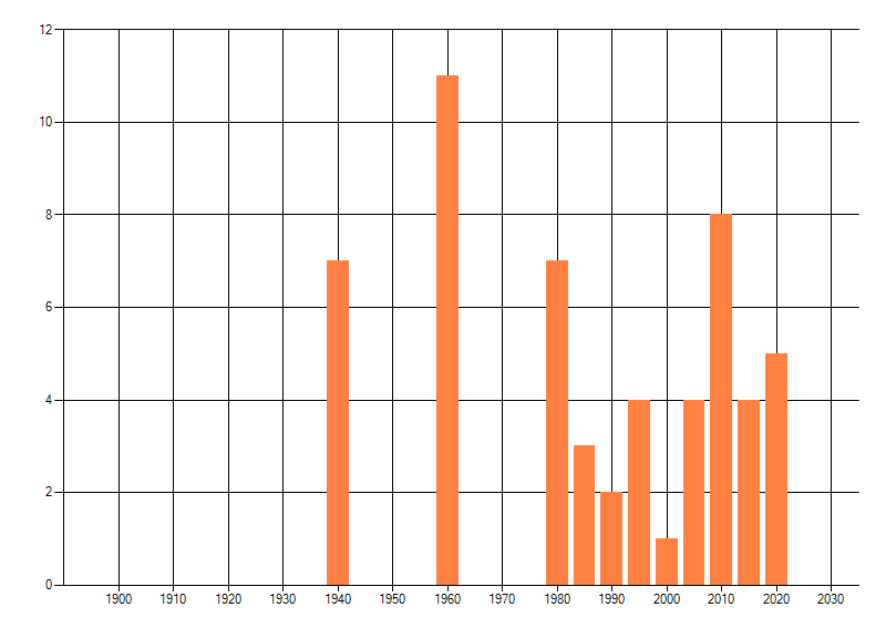 Het aantal atlasblokken (5x5 km) waarin de soort is gemeld binnen een periode van vijf jaar (vanaf 1980) of twintig jaar. Niet gecorrigeerd voor waarnemersinspanning en het aantal doorgegeven waarnemingen kan sterk variëren per periode, dus een trend in verspreiding kan hier niet direct uit worden afgelezen. Het opgegeven jaartal is het eerste jaar van de periode. Bron: gevalideerde waarnemingen uit de NDFF.