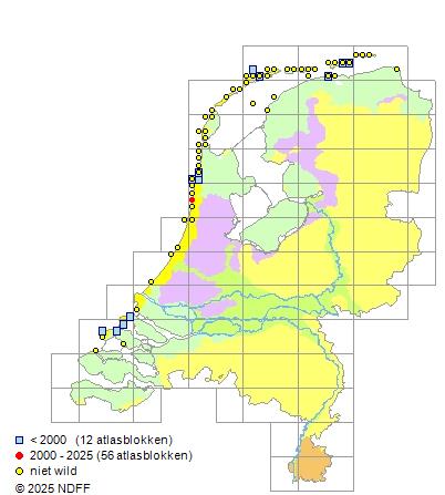 Het aantal atlasblokken (5x5 km) waarin de soort is gemeld binnen een periode van vijf jaar (vanaf 1980) of twintig jaar. Niet gecorrigeerd voor waarnemersinspanning en het aantal doorgegeven waarnemingen kan sterk variëren per periode, dus een trend in verspreiding kan hier niet direct uit worden afgelezen. Het opgegeven jaartal is het eerste jaar van de periode. Bron: gevalideerde waarnemingen uit de NDFF.