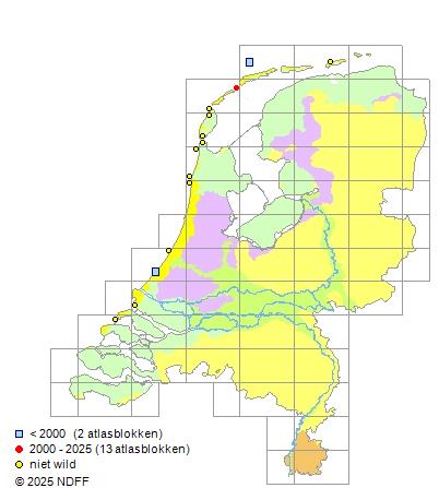 Het aantal atlasblokken (5x5 km) waarin de soort is gemeld binnen een periode van vijf jaar (vanaf 1980) of twintig jaar. Niet gecorrigeerd voor waarnemersinspanning en het aantal doorgegeven waarnemingen kan sterk variëren per periode, dus een trend in verspreiding kan hier niet direct uit worden afgelezen. Het opgegeven jaartal is het eerste jaar van de periode. Bron: gevalideerde waarnemingen uit de NDFF.
