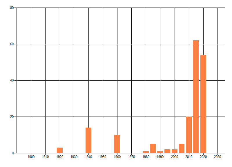 Het aantal atlasblokken (5x5 km) waarin de soort is gemeld binnen een periode van vijf jaar (vanaf 1980) of twintig jaar. Niet gecorrigeerd voor waarnemersinspanning en het aantal doorgegeven waarnemingen kan sterk variëren per periode, dus een trend in verspreiding kan hier niet direct uit worden afgelezen. Het opgegeven jaartal is het eerste jaar van de periode. Bron: gevalideerde waarnemingen uit de NDFF.