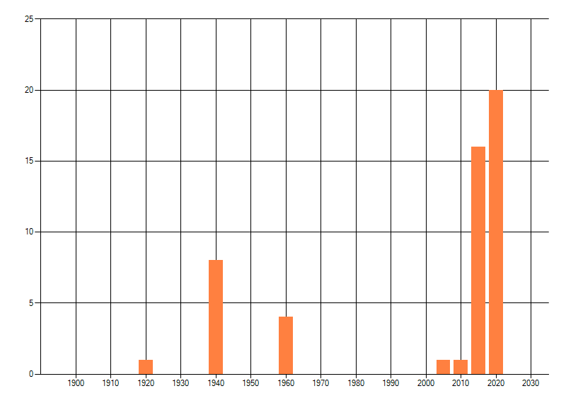 Het aantal atlasblokken (5x5 km) waarin de soort is gemeld binnen een periode van vijf jaar (vanaf 1980) of twintig jaar. Niet gecorrigeerd voor waarnemersinspanning en het aantal doorgegeven waarnemingen kan sterk variëren per periode, dus een trend in verspreiding kan hier niet direct uit worden afgelezen. Het opgegeven jaartal is het eerste jaar van de periode. Bron: gevalideerde waarnemingen uit de NDFF.