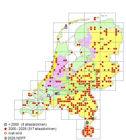 Het aantal atlasblokken (5x5 km) waarin de soort is gemeld binnen een periode van vijf jaar (vanaf 1980) of twintig jaar. Niet gecorrigeerd voor waarnemersinspanning en het aantal doorgegeven waarnemingen kan sterk variëren per periode, dus een trend in verspreiding kan hier niet direct uit worden afgelezen. Het opgegeven jaartal is het eerste jaar van de periode. Bron: gevalideerde waarnemingen uit de NDFF.