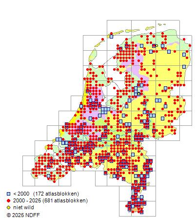Het aantal atlasblokken (5x5 km) waarin de soort is gemeld binnen een periode van vijf jaar (vanaf 1980) of twintig jaar. Niet gecorrigeerd voor waarnemersinspanning en het aantal doorgegeven waarnemingen kan sterk variëren per periode, dus een trend in verspreiding kan hier niet direct uit worden afgelezen. Het opgegeven jaartal is het eerste jaar van de periode. Bron: gevalideerde waarnemingen uit de NDFF.