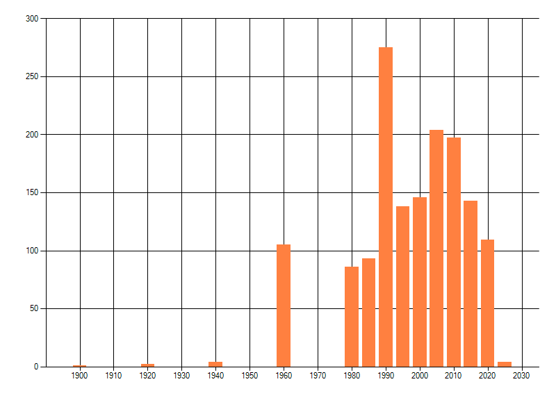 Het aantal atlasblokken (5x5 km) waarin de soort is gemeld binnen een periode van vijf jaar (vanaf 1980) of twintig jaar. Niet gecorrigeerd voor waarnemersinspanning en het aantal doorgegeven waarnemingen kan sterk variëren per periode, dus een trend in verspreiding kan hier niet direct uit worden afgelezen. Het opgegeven jaartal is het eerste jaar van de periode. Bron: gevalideerde waarnemingen uit de NDFF.