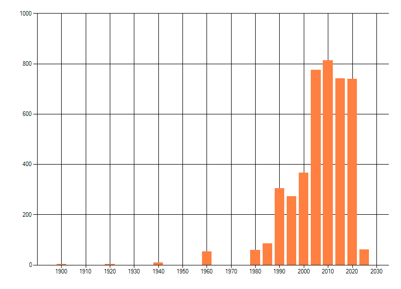 Het aantal atlasblokken (5x5 km) waarin de soort is gemeld binnen een periode van vijf jaar (vanaf 1980) of twintig jaar. Niet gecorrigeerd voor waarnemersinspanning en het aantal doorgegeven waarnemingen kan sterk variëren per periode, dus een trend in verspreiding kan hier niet direct uit worden afgelezen. Het opgegeven jaartal is het eerste jaar van de periode. Bron: gevalideerde waarnemingen uit de NDFF.