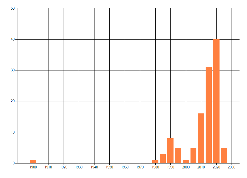 Het aantal atlasblokken (5x5 km) waarin de soort is gemeld binnen een periode van vijf jaar (vanaf 1980) of twintig jaar. Niet gecorrigeerd voor waarnemersinspanning en het aantal doorgegeven waarnemingen kan sterk variëren per periode, dus een trend in verspreiding kan hier niet direct uit worden afgelezen. Het opgegeven jaartal is het eerste jaar van de periode. Bron: gevalideerde waarnemingen uit de NDFF.