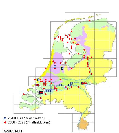 Het aantal atlasblokken (5x5 km) waarin de soort is gemeld binnen een periode van vijf jaar (vanaf 1980) of twintig jaar. Niet gecorrigeerd voor waarnemersinspanning en het aantal doorgegeven waarnemingen kan sterk variëren per periode, dus een trend in verspreiding kan hier niet direct uit worden afgelezen. Het opgegeven jaartal is het eerste jaar van de periode. Bron: gevalideerde waarnemingen uit de NDFF.