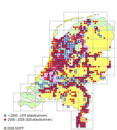 Het aantal atlasblokken (5x5 km) waarin de soort is gemeld binnen een periode van vijf jaar (vanaf 1980) of twintig jaar.
