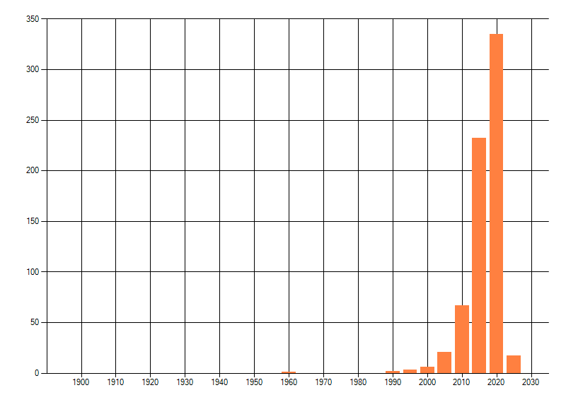 Het aantal atlasblokken (5x5 km) waarin de soort is gemeld binnen een periode van vijf jaar (vanaf 1980) of twintig jaar. Niet gecorrigeerd voor waarnemersinspanning en het aantal doorgegeven waarnemingen kan sterk variëren per periode, dus een trend in verspreiding kan hier niet direct uit worden afgelezen. Het opgegeven jaartal is het eerste jaar van de periode. Bron: gevalideerde waarnemingen uit de NDFF.