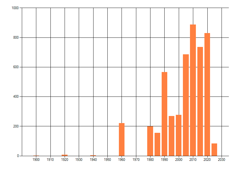 Het aantal atlasblokken (5x5 km) waarin de soort is gemeld binnen een periode van vijf jaar (vanaf 1980) of twintig jaar. Niet gecorrigeerd voor waarnemersinspanning en het aantal doorgegeven waarnemingen kan sterk variëren per periode, dus een trend in verspreiding kan hier niet direct uit worden afgelezen. Het opgegeven jaartal is het eerste jaar van de periode. Bron: gevalideerde waarnemingen uit de NDFF.