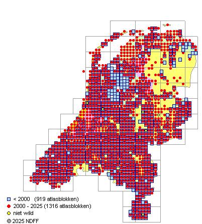 Het aantal atlasblokken (5x5 km) waarin de soort is gemeld binnen een periode van vijf jaar (vanaf 1980) of twintig jaar. Niet gecorrigeerd voor waarnemersinspanning en het aantal doorgegeven waarnemingen kan sterk variëren per periode, dus een trend in verspreiding kan hier niet direct uit worden afgelezen. Het opgegeven jaartal is het eerste jaar van de periode. Bron: gevalideerde waarnemingen uit de NDFF.
