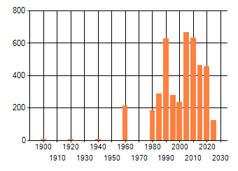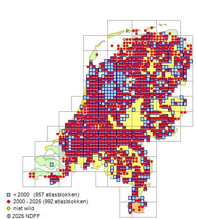 Het aantal atlasblokken (5x5 km) waarin de soort is gemeld binnen een periode van vijf jaar (vanaf 1980) of twintig jaar. Niet gecorrigeerd voor waarnemersinspanning en het aantal doorgegeven waarnemingen kan sterk variëren per periode, dus een trend in verspreiding kan hier niet direct uit worden afgelezen. Het opgegeven jaartal is het eerste jaar van de periode. Bron: gevalideerde waarnemingen uit de NDFF.