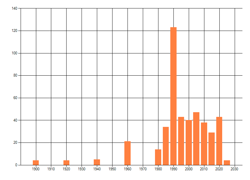 Het aantal atlasblokken (5x5 km) waarin de soort is gemeld binnen een periode van vijf jaar (vanaf 1980) of twintig jaar. Niet gecorrigeerd voor waarnemersinspanning en het aantal doorgegeven waarnemingen kan sterk variëren per periode, dus een trend in verspreiding kan hier niet direct uit worden afgelezen. Het opgegeven jaartal is het eerste jaar van de periode. Bron: gevalideerde waarnemingen uit de NDFF.