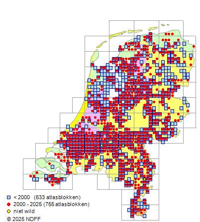 Het aantal atlasblokken (5x5 km) waarin de soort is gemeld binnen een periode van vijf jaar (vanaf 1980) of twintig jaar. Niet gecorrigeerd voor waarnemersinspanning en het aantal doorgegeven waarnemingen kan sterk variëren per periode, dus een trend in verspreiding kan hier niet direct uit worden afgelezen. Het opgegeven jaartal is het eerste jaar van de periode. Bron: gevalideerde waarnemingen uit de NDFF.