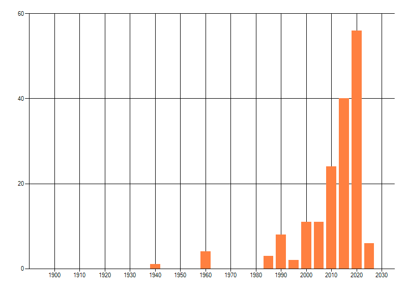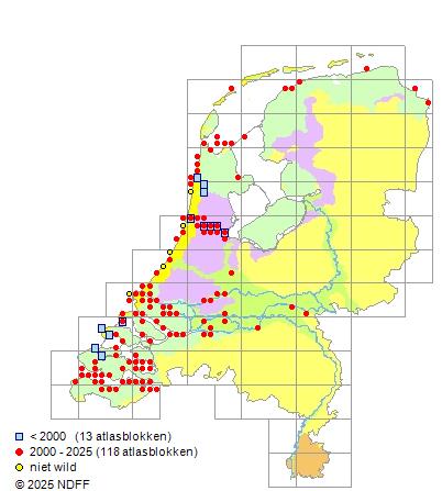 Het aantal atlasblokken (5x5 km) waarin de soort is gemeld binnen een periode van vijf jaar (vanaf 1980) of twintig jaar. Niet gecorrigeerd voor waarnemersinspanning en het aantal doorgegeven waarnemingen kan sterk variëren per periode, dus een trend in verspreiding kan hier niet direct uit worden afgelezen. Het opgegeven jaartal is het eerste jaar van de periode. Bron: gevalideerde waarnemingen uit de NDFF.