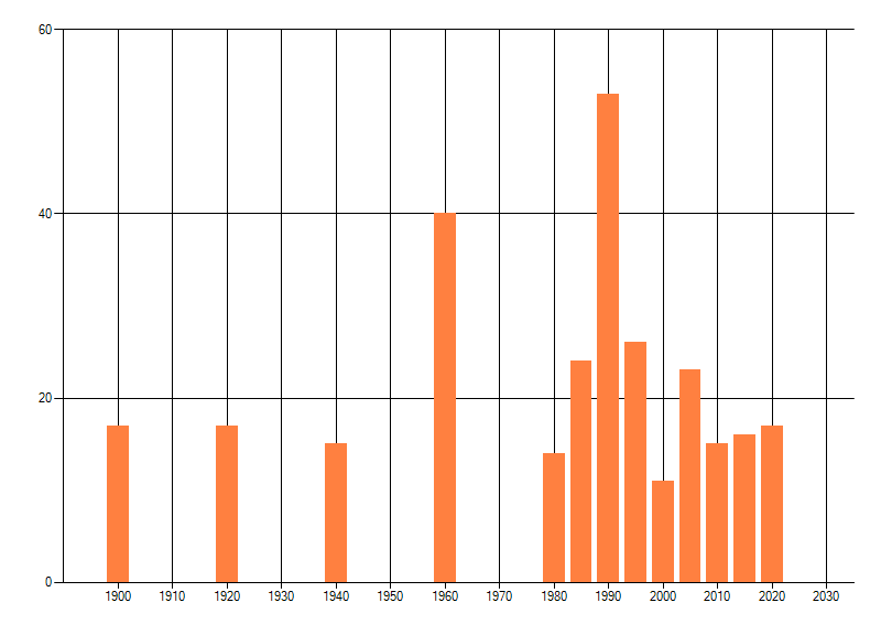 Het aantal atlasblokken (5x5 km) waarin de soort is gemeld binnen een periode van vijf jaar (vanaf 1980) of twintig jaar. Niet gecorrigeerd voor waarnemersinspanning en het aantal doorgegeven waarnemingen kan sterk variëren per periode, dus een trend in verspreiding kan hier niet direct uit worden afgelezen. Het opgegeven jaartal is het eerste jaar van de periode. Bron: gevalideerde waarnemingen uit de NDFF.