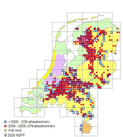 Het aantal atlasblokken (5x5 km) waarin de soort is gemeld binnen een periode van vijf jaar (vanaf 1980) of twintig jaar.