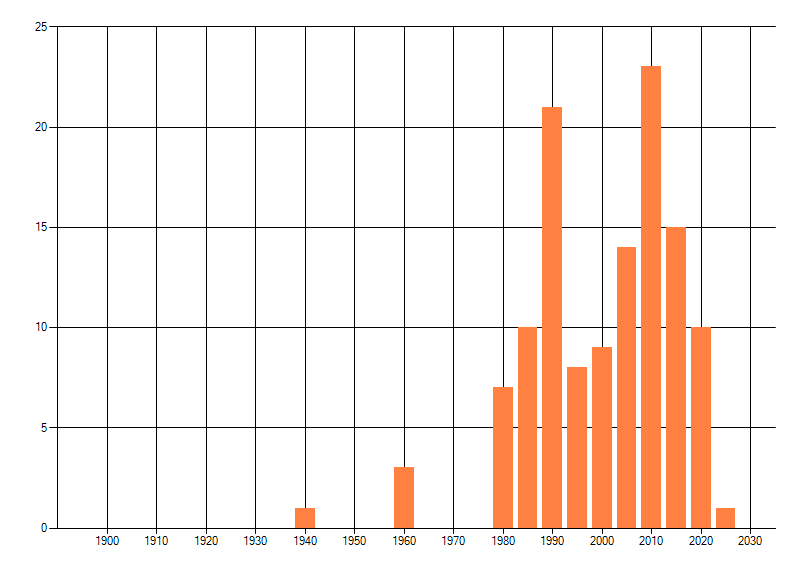 Het aantal atlasblokken (5x5 km) waarin de soort is gemeld binnen een periode van vijf jaar (vanaf 1980) of twintig jaar. Niet gecorrigeerd voor waarnemersinspanning en het aantal doorgegeven waarnemingen kan sterk variëren per periode, dus een trend in verspreiding kan hier niet direct uit worden afgelezen. Het opgegeven jaartal is het eerste jaar van de periode. Bron: gevalideerde waarnemingen uit de NDFF.