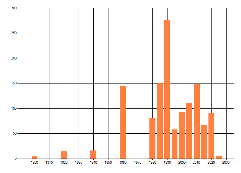 Het aantal atlasblokken (5x5 km) waarin de soort is gemeld binnen een periode van vijf jaar (vanaf 1980) of twintig jaar. Niet gecorrigeerd voor waarnemersinspanning en het aantal doorgegeven waarnemingen kan sterk variëren per periode, dus een trend in verspreiding kan hier niet direct uit worden afgelezen. Het opgegeven jaartal is het eerste jaar van de periode. Bron: gevalideerde waarnemingen uit de NDFF.
