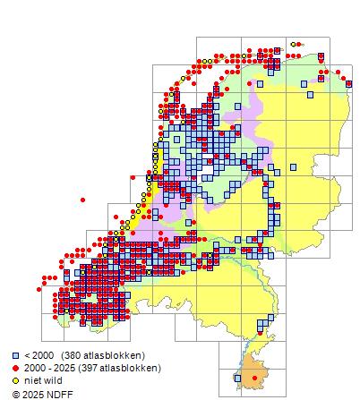 Het aantal atlasblokken (5x5 km) waarin de soort is gemeld binnen een periode van vijf jaar (vanaf 1980) of twintig jaar. Niet gecorrigeerd voor waarnemersinspanning en het aantal doorgegeven waarnemingen kan sterk variëren per periode, dus een trend in verspreiding kan hier niet direct uit worden afgelezen. Het opgegeven jaartal is het eerste jaar van de periode. Bron: gevalideerde waarnemingen uit de NDFF.