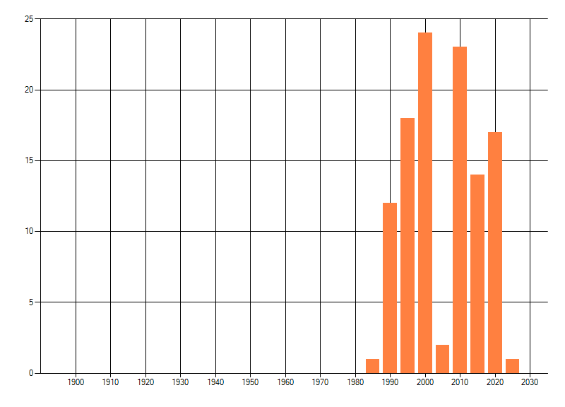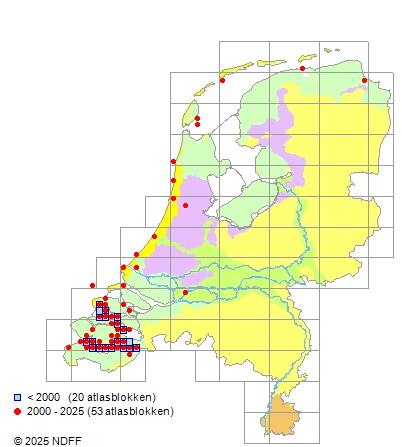 Het aantal atlasblokken (5x5 km) waarin de soort is gemeld binnen een periode van vijf jaar (vanaf 1980) of twintig jaar. Niet gecorrigeerd voor waarnemersinspanning en het aantal doorgegeven waarnemingen kan sterk variëren per periode, dus een trend in verspreiding kan hier niet direct uit worden afgelezen. Het opgegeven jaartal is het eerste jaar van de periode. Bron: gevalideerde waarnemingen uit de NDFF.