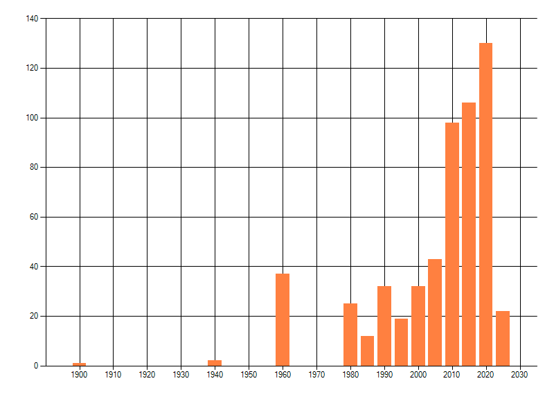Het aantal atlasblokken (5x5 km) waarin de soort is gemeld binnen een periode van vijf jaar (vanaf 1980) of twintig jaar. Niet gecorrigeerd voor waarnemersinspanning en het aantal doorgegeven waarnemingen kan sterk variëren per periode, dus een trend in verspreiding kan hier niet direct uit worden afgelezen. Het opgegeven jaartal is het eerste jaar van de periode. Bron: gevalideerde waarnemingen uit de NDFF.
