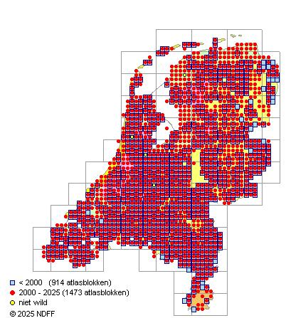 Het aantal atlasblokken (5x5 km) waarin de soort is gemeld binnen een periode van vijf jaar (vanaf 1980) of twintig jaar. Niet gecorrigeerd voor waarnemersinspanning en het aantal doorgegeven waarnemingen kan sterk variëren per periode, dus een trend in verspreiding kan hier niet direct uit worden afgelezen. Het opgegeven jaartal is het eerste jaar van de periode. Bron: gevalideerde waarnemingen uit de NDFF.