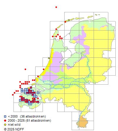 Het aantal atlasblokken (5x5 km) waarin de soort is gemeld binnen een periode van vijf jaar (vanaf 1980) of twintig jaar. Niet gecorrigeerd voor waarnemersinspanning en het aantal doorgegeven waarnemingen kan sterk variëren per periode, dus een trend in verspreiding kan hier niet direct uit worden afgelezen. Het opgegeven jaartal is het eerste jaar van de periode. Bron: gevalideerde waarnemingen uit de NDFF.