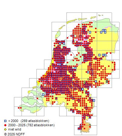 Het aantal atlasblokken (5x5 km) waarin de soort is gemeld binnen een periode van vijf jaar (vanaf 1980) of twintig jaar. Niet gecorrigeerd voor waarnemersinspanning en het aantal doorgegeven waarnemingen kan sterk variëren per periode, dus een trend in verspreiding kan hier niet direct uit worden afgelezen. Het opgegeven jaartal is het eerste jaar van de periode. Bron: gevalideerde waarnemingen uit de NDFF.
