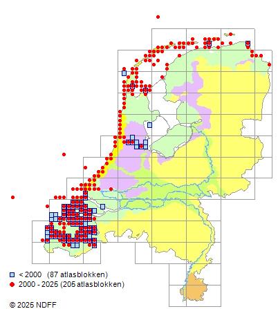 Het aantal atlasblokken (5x5 km) waarin de soort is gemeld binnen een periode van vijf jaar (vanaf 1980) of twintig jaar. Niet gecorrigeerd voor waarnemersinspanning en het aantal doorgegeven waarnemingen kan sterk variëren per periode, dus een trend in verspreiding kan hier niet direct uit worden afgelezen. Het opgegeven jaartal is het eerste jaar van de periode. Bron: gevalideerde waarnemingen uit de NDFF.