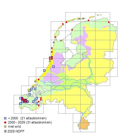 Het aantal atlasblokken (5x5 km) waarin de soort is gemeld binnen een periode van vijf jaar (vanaf 1980) of twintig jaar. Niet gecorrigeerd voor waarnemersinspanning en het aantal doorgegeven waarnemingen kan sterk variëren per periode, dus een trend in verspreiding kan hier niet direct uit worden afgelezen. Het opgegeven jaartal is het eerste jaar van de periode. Bron: gevalideerde waarnemingen uit de NDFF.