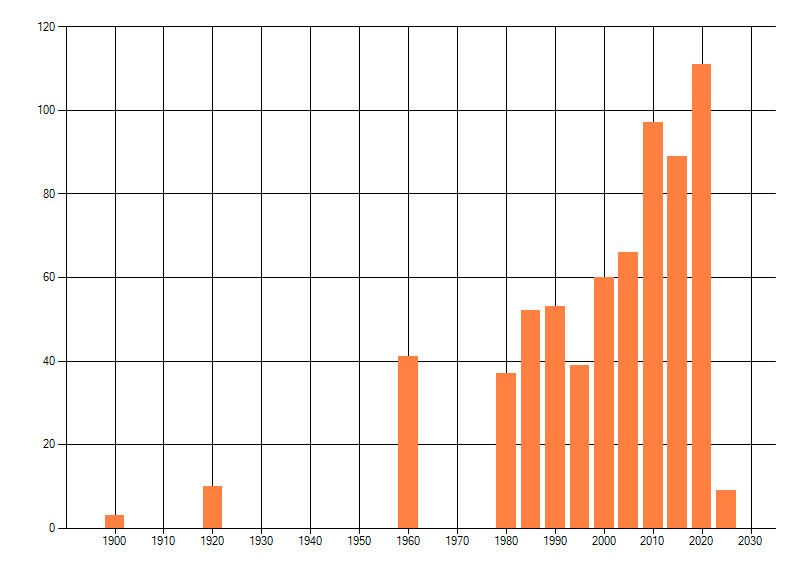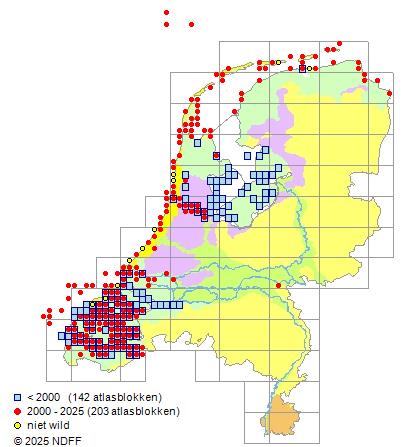Het aantal atlasblokken (5x5 km) waarin de soort is gemeld binnen een periode van vijf jaar (vanaf 1980) of twintig jaar. Niet gecorrigeerd voor waarnemersinspanning en het aantal doorgegeven waarnemingen kan sterk variëren per periode, dus een trend in verspreiding kan hier niet direct uit worden afgelezen. Het opgegeven jaartal is het eerste jaar van de periode. Bron: gevalideerde waarnemingen uit de NDFF.