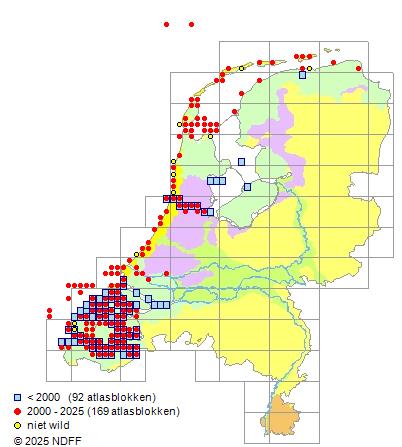 Het aantal atlasblokken (5x5 km) waarin de soort is gemeld binnen een periode van vijf jaar (vanaf 1980) of twintig jaar. Niet gecorrigeerd voor waarnemersinspanning en het aantal doorgegeven waarnemingen kan sterk variëren per periode, dus een trend in verspreiding kan hier niet direct uit worden afgelezen. Het opgegeven jaartal is het eerste jaar van de periode. Bron: gevalideerde waarnemingen uit de NDFF.