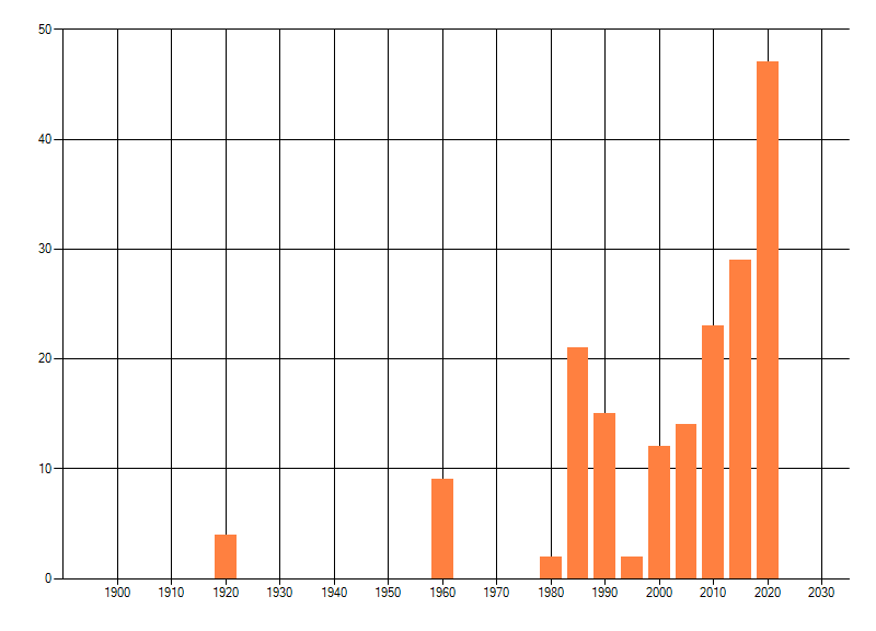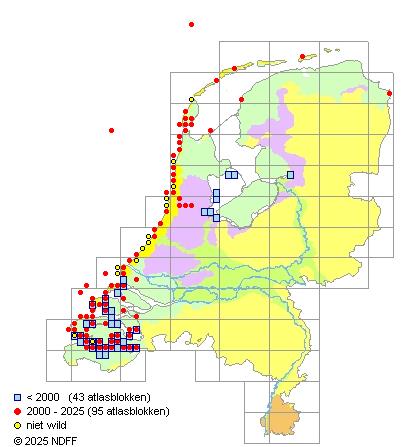 Het aantal atlasblokken (5x5 km) waarin de soort is gemeld binnen een periode van vijf jaar (vanaf 1980) of twintig jaar. Niet gecorrigeerd voor waarnemersinspanning en het aantal doorgegeven waarnemingen kan sterk variëren per periode, dus een trend in verspreiding kan hier niet direct uit worden afgelezen. Het opgegeven jaartal is het eerste jaar van de periode. Bron: gevalideerde waarnemingen uit de NDFF.
