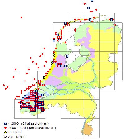 Het aantal atlasblokken (5x5 km) waarin de soort is gemeld binnen een periode van vijf jaar (vanaf 1980) of twintig jaar. Niet gecorrigeerd voor waarnemersinspanning en het aantal doorgegeven waarnemingen kan sterk variëren per periode, dus een trend in verspreiding kan hier niet direct uit worden afgelezen. Het opgegeven jaartal is het eerste jaar van de periode. Bron: gevalideerde waarnemingen uit de NDFF.