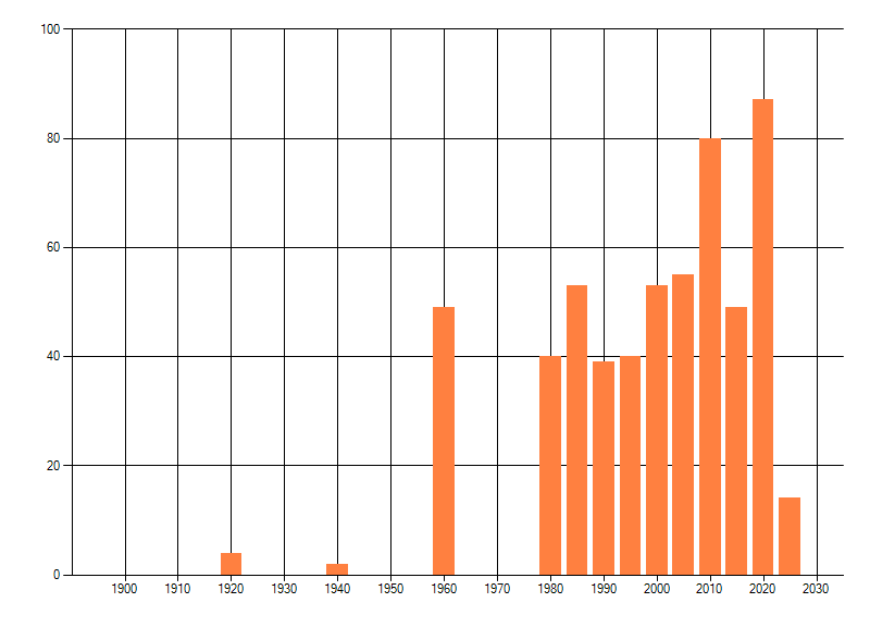 Het aantal atlasblokken (5x5 km) waarin de soort is gemeld binnen een periode van vijf jaar (vanaf 1980) of twintig jaar. Niet gecorrigeerd voor waarnemersinspanning en het aantal doorgegeven waarnemingen kan sterk variëren per periode, dus een trend in verspreiding kan hier niet direct uit worden afgelezen. Het opgegeven jaartal is het eerste jaar van de periode. Bron: gevalideerde waarnemingen uit de NDFF.