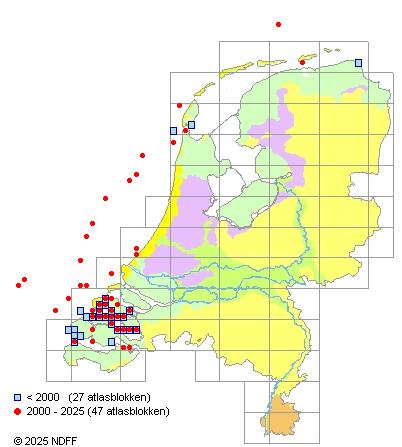 Het aantal atlasblokken (5x5 km) waarin de soort is gemeld binnen een periode van vijf jaar (vanaf 1980) of twintig jaar. Niet gecorrigeerd voor waarnemersinspanning en het aantal doorgegeven waarnemingen kan sterk variëren per periode, dus een trend in verspreiding kan hier niet direct uit worden afgelezen. Het opgegeven jaartal is het eerste jaar van de periode. Bron: gevalideerde waarnemingen uit de NDFF.