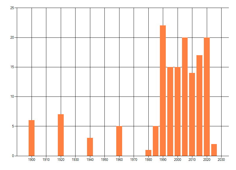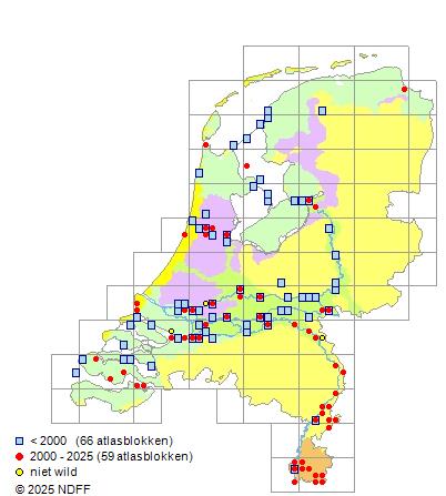 Het aantal atlasblokken (5x5 km) waarin de soort is gemeld binnen een periode van vijf jaar (vanaf 1980) of twintig jaar. Niet gecorrigeerd voor waarnemersinspanning en het aantal doorgegeven waarnemingen kan sterk variëren per periode, dus een trend in verspreiding kan hier niet direct uit worden afgelezen. Het opgegeven jaartal is het eerste jaar van de periode. Bron: gevalideerde waarnemingen uit de NDFF.