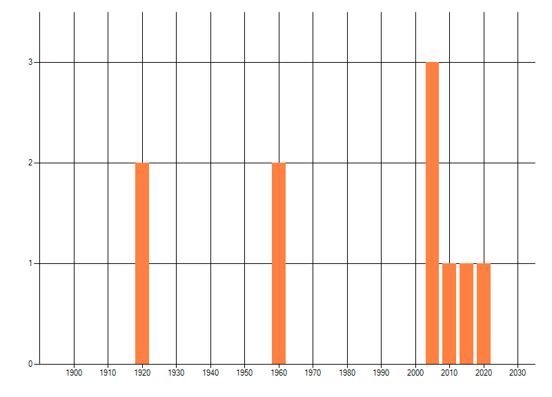 Het aantal atlasblokken (5x5 km) waarin de soort is gemeld binnen een periode van vijf jaar (vanaf 1980) of twintig jaar. Niet gecorrigeerd voor waarnemersinspanning en het aantal doorgegeven waarnemingen kan sterk variëren per periode, dus een trend in verspreiding kan hier niet direct uit worden afgelezen. Het opgegeven jaartal is het eerste jaar van de periode. Bron: gevalideerde waarnemingen uit de NDFF.