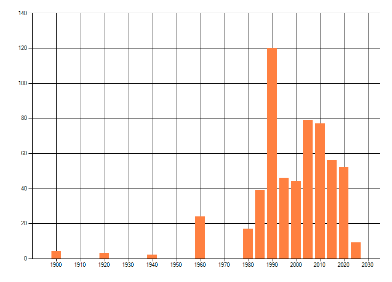 Het aantal atlasblokken (5x5 km) waarin de soort is gemeld binnen een periode van vijf jaar (vanaf 1980) of twintig jaar. Niet gecorrigeerd voor waarnemersinspanning en het aantal doorgegeven waarnemingen kan sterk variëren per periode, dus een trend in verspreiding kan hier niet direct uit worden afgelezen. Het opgegeven jaartal is het eerste jaar van de periode. Bron: gevalideerde waarnemingen uit de NDFF.