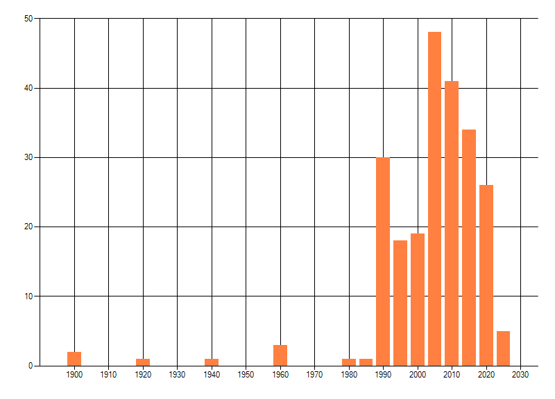 Het aantal atlasblokken (5x5 km) waarin de soort is gemeld binnen een periode van vijf jaar (vanaf 1980) of twintig jaar. Niet gecorrigeerd voor waarnemersinspanning en het aantal doorgegeven waarnemingen kan sterk variëren per periode, dus een trend in verspreiding kan hier niet direct uit worden afgelezen. Het opgegeven jaartal is het eerste jaar van de periode. Bron: gevalideerde waarnemingen uit de NDFF.