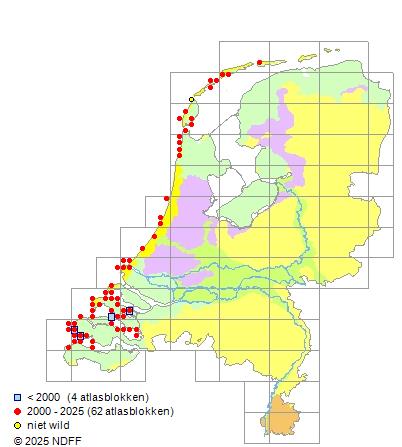 Het aantal atlasblokken (5x5 km) waarin de soort is gemeld binnen een periode van vijf jaar (vanaf 1980) of twintig jaar. Niet gecorrigeerd voor waarnemersinspanning en het aantal doorgegeven waarnemingen kan sterk variëren per periode, dus een trend in verspreiding kan hier niet direct uit worden afgelezen. Het opgegeven jaartal is het eerste jaar van de periode. Bron: gevalideerde waarnemingen uit de NDFF.